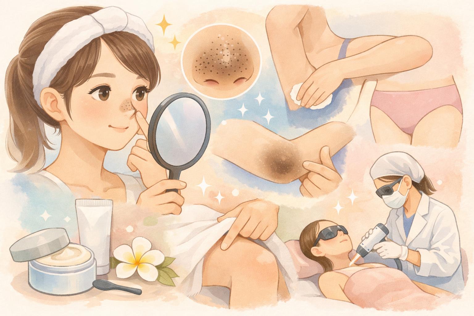 脇やデリケートゾーン、ひじ、ひざなどの体の黒ずみは、衣類との摩擦や自己処理、生活習慣が大きく影響します。顔とは皮膚の厚さも異なるため、部位に合わせた適切なケアが必要です。